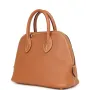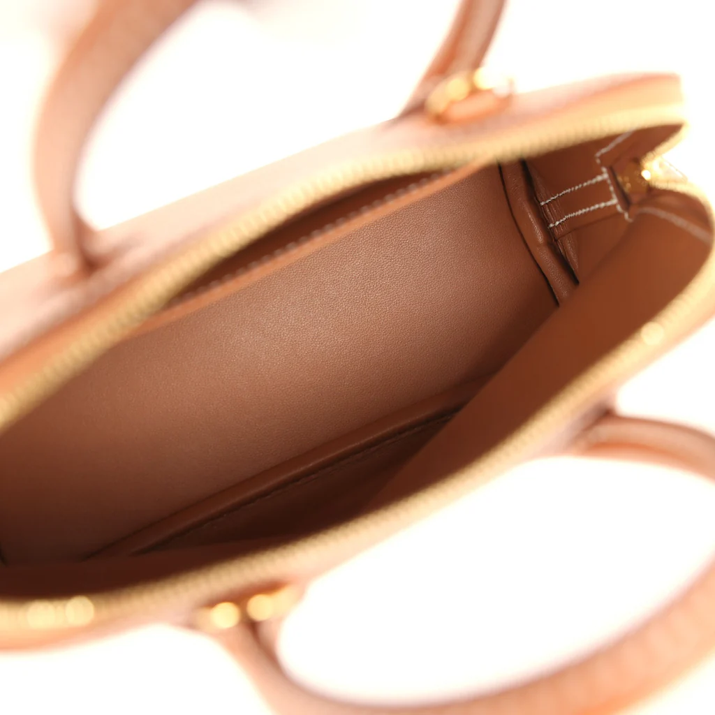 This Mini 1923 Bolide is in Gold evercolor leather with gold hardware, has contrast stitching, a top zipper closure, double rolled handles and a removable shoulder strap.