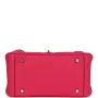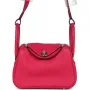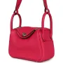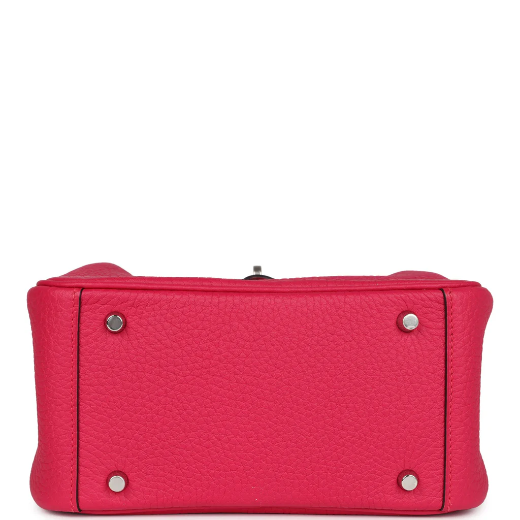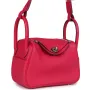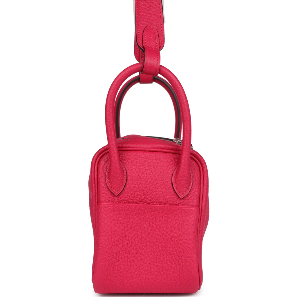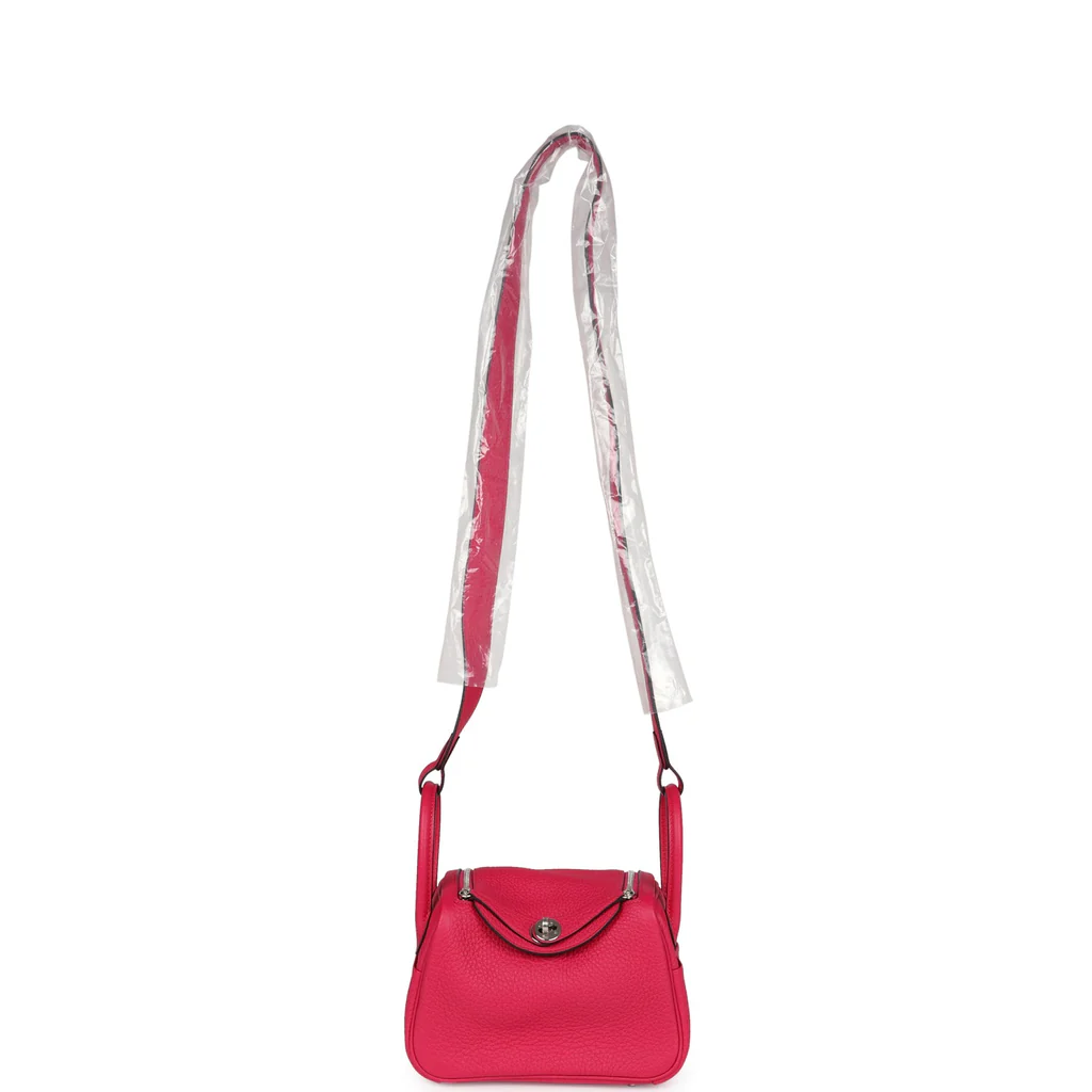This Mini Lindy is in Framboise clemence leather with palladium hardware and has tonal stitching, double zipper pulls, front Hermes twist lock, single pocket on each side, two rolled top handles linked by a flat shoulder strap.