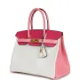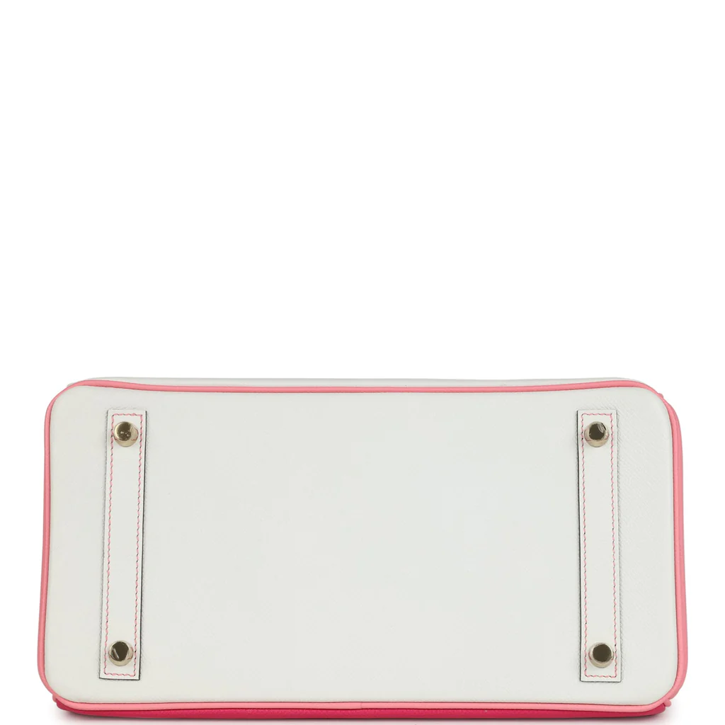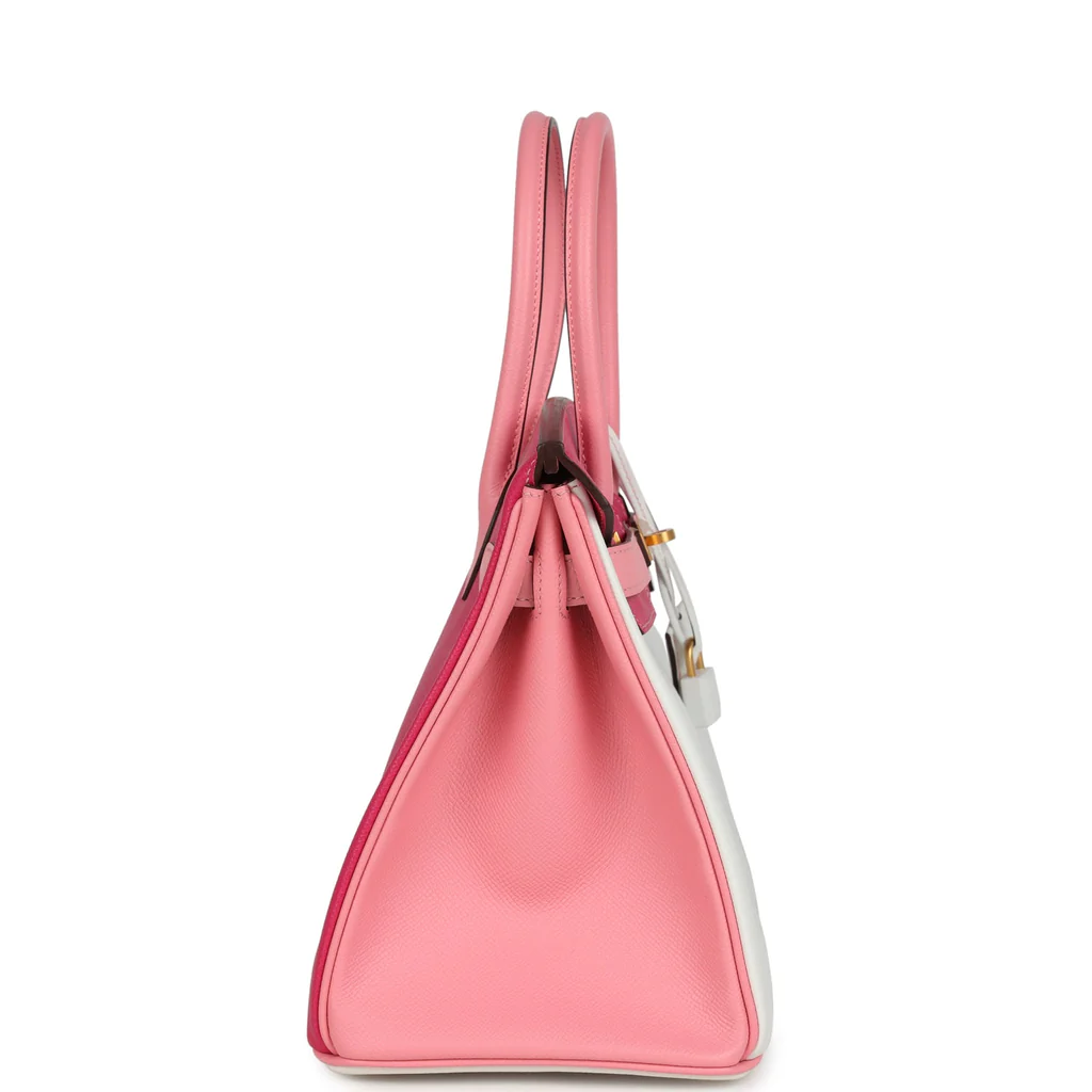 This Special Order Tri-color Birkin is in White, Rose Confetti, Rose Tyrien epsom leather with brushed gold hardware, featuring tonal and contrast stitching, front flap, two straps with center toggle closure, clochette with lock and two keys, and double rolled handles.