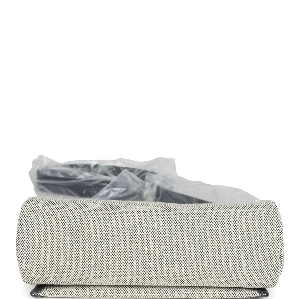 This Hermes Herbag Zip 20 Mini Ecru and Ardoise Toile H canvas and Ardoise Vache Hunter leather with palladium hardware has tonal stitching, front flap, two straps with center clou de selle closure, back zip pocket and black shoulder strap.
