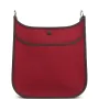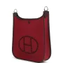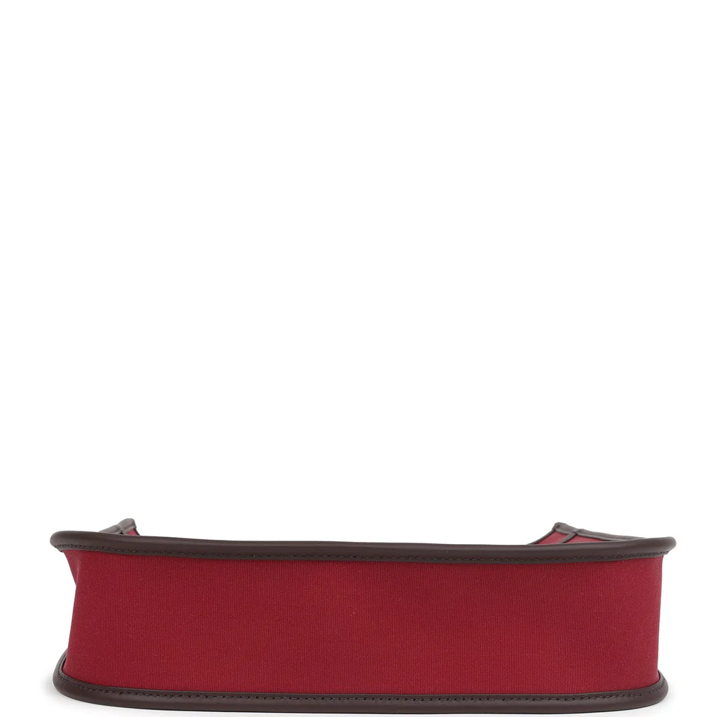 This Hermes Neo Evelyne PM is in Rubis Officier canvas and Rouge Sellier swift leather with palladium hardware, featuring tonal stitching, large perforated H in circle (front), pull tab top snap closure and a removable Rouge Sellier swift leather shoulder/crossbody strap.
