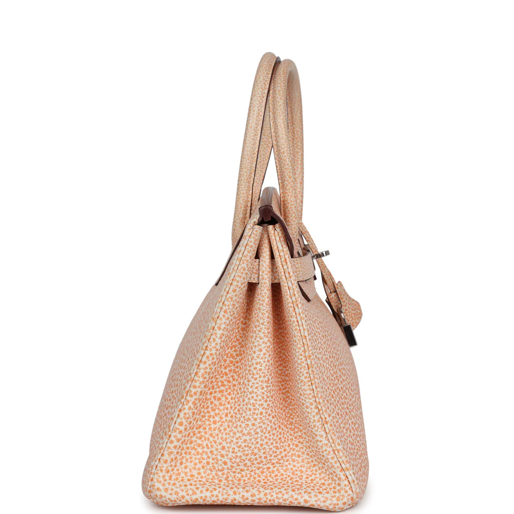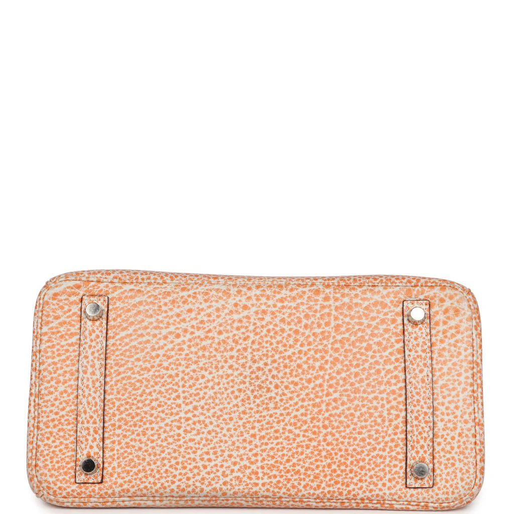 This vintage Birkin is in Orange Dalmatian Buffalo leather with palladium hardware and has tonal stitching, a front toggle closure, a clochette with lock and two keys, and double rolled handles.
